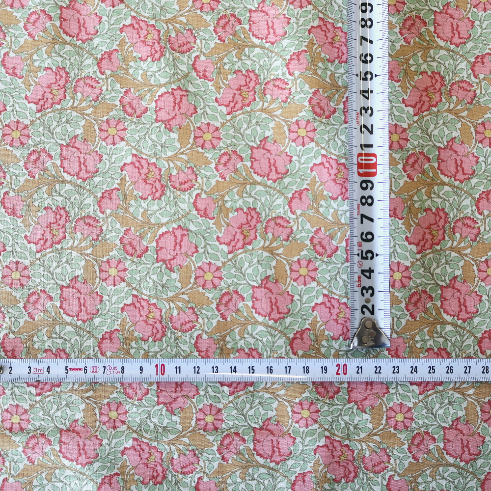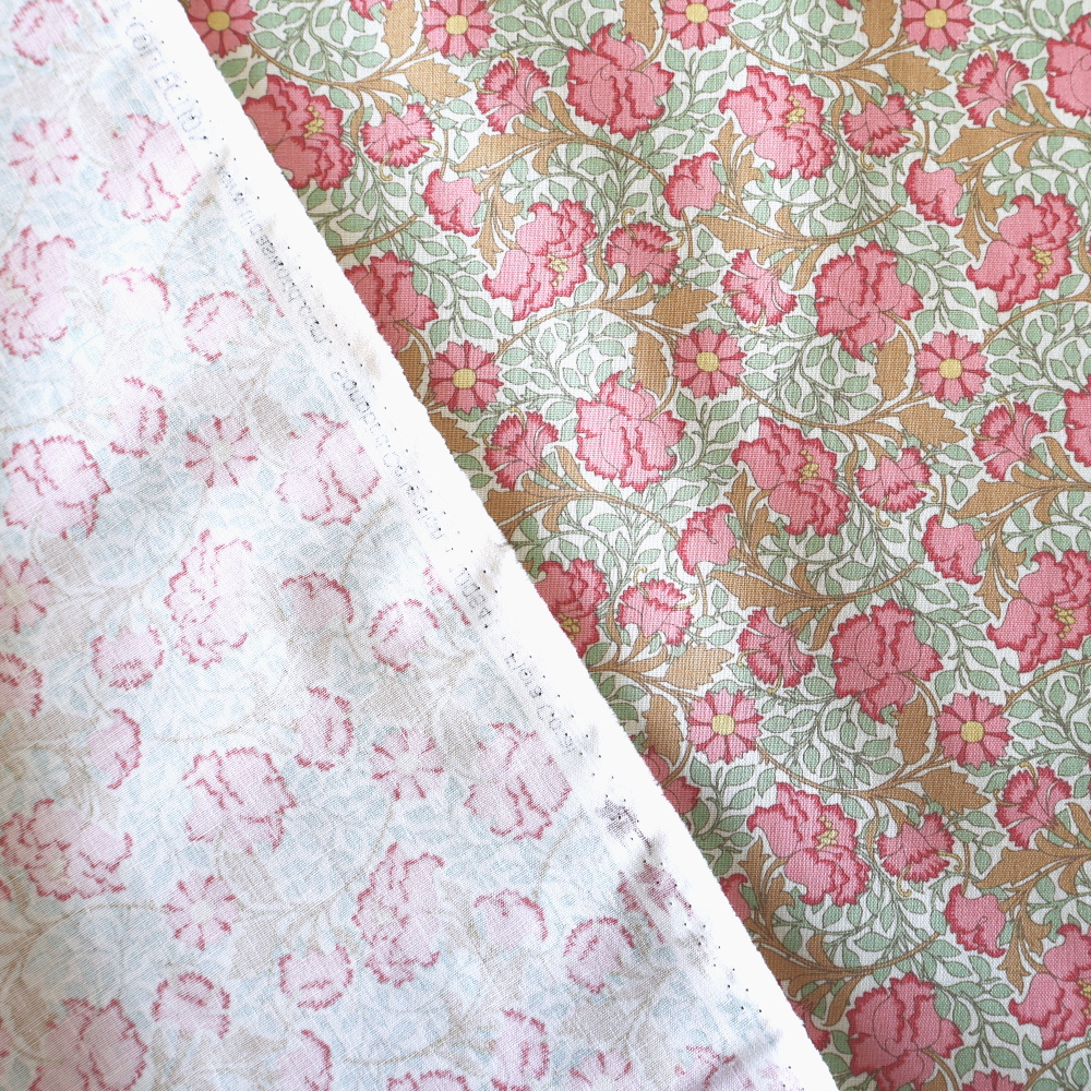 ピンクの花に、ベージュのつる葉が重なり、やわらかく奥行きのある印象に。細かな線で描かれているため、小さなアイテムでも柄がきれいに映えます。なめらかなコットンで扱いやすい質感です。