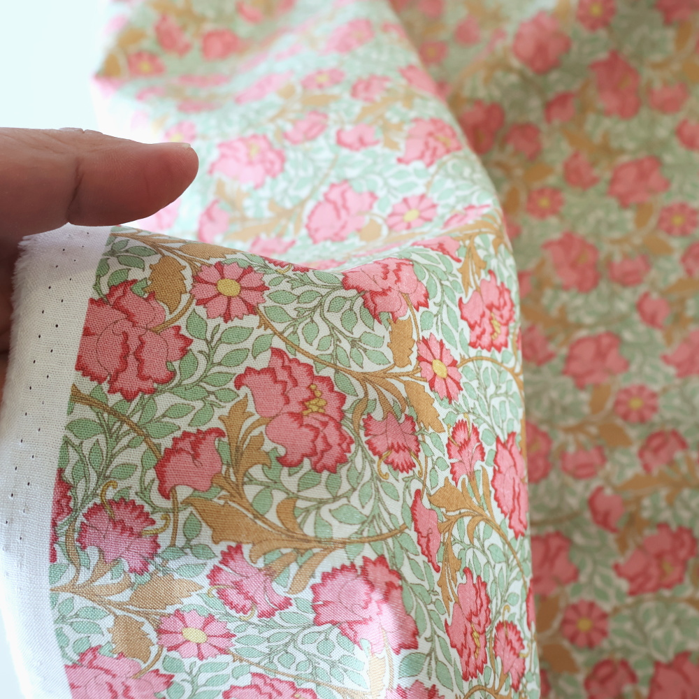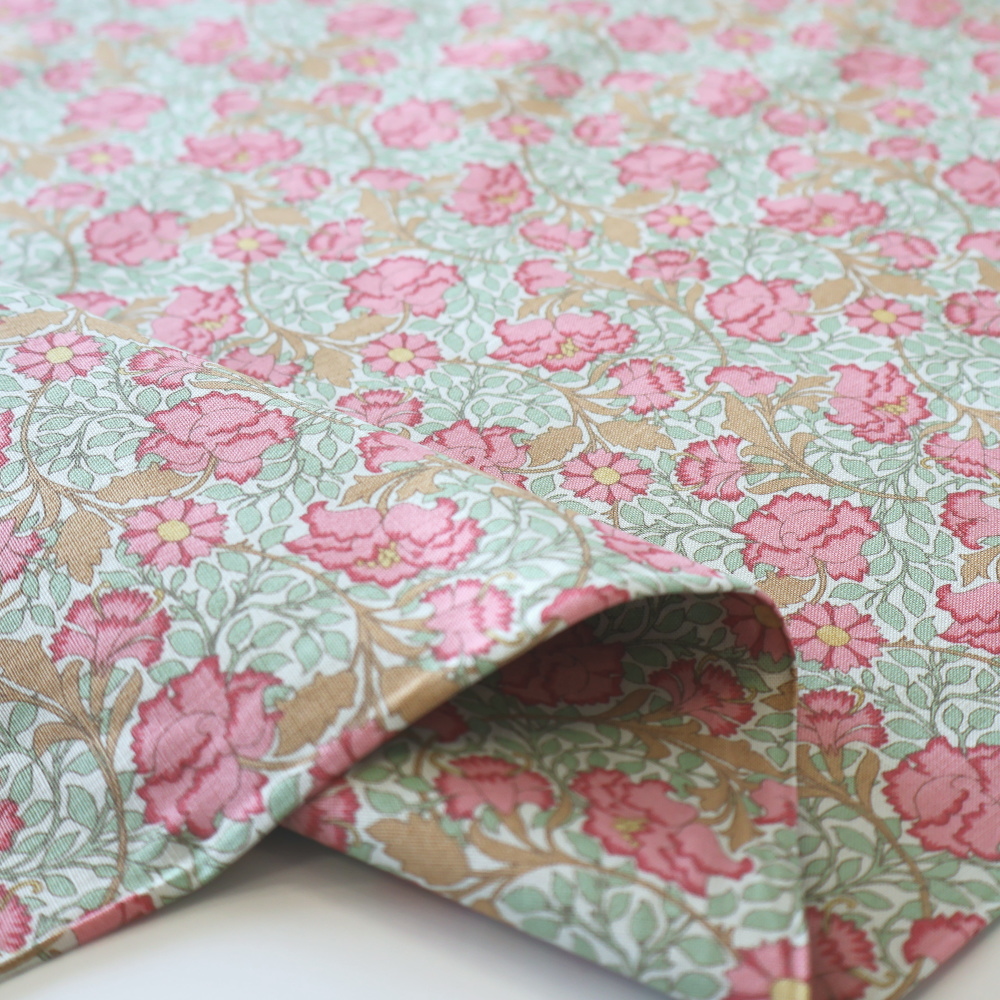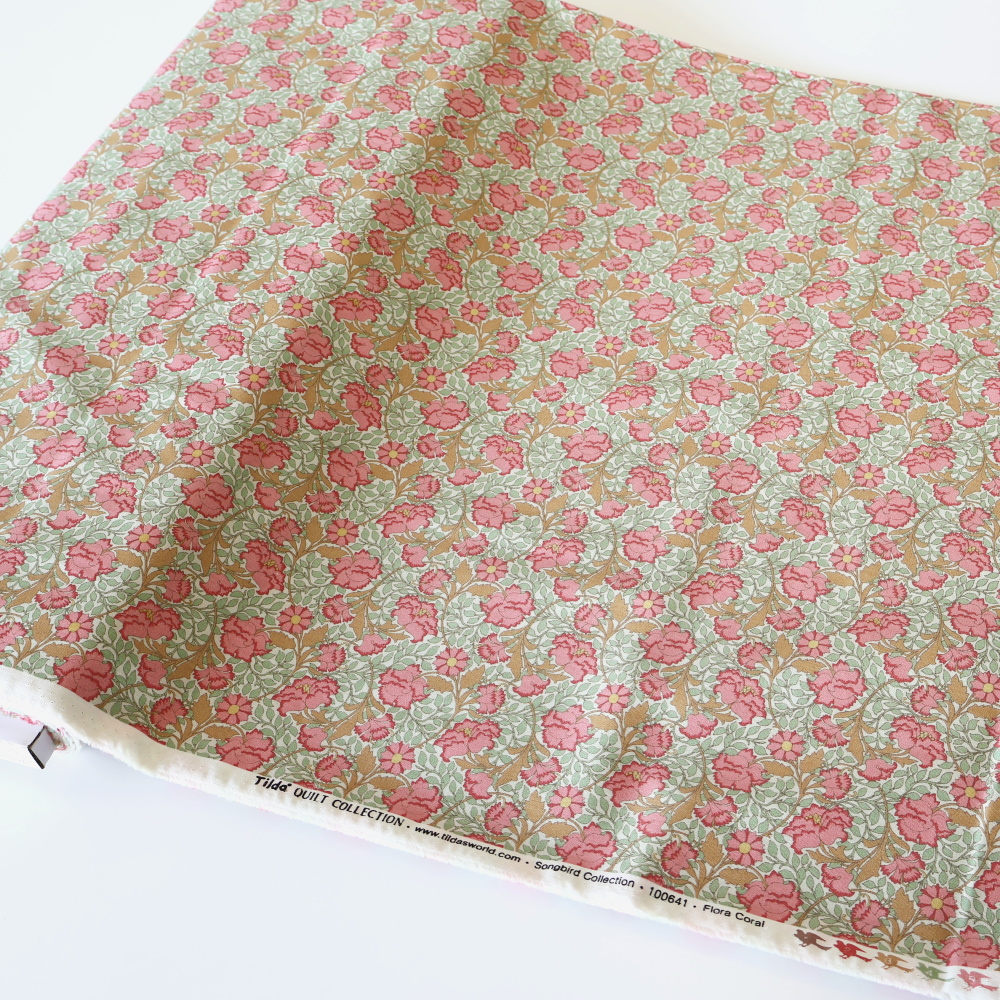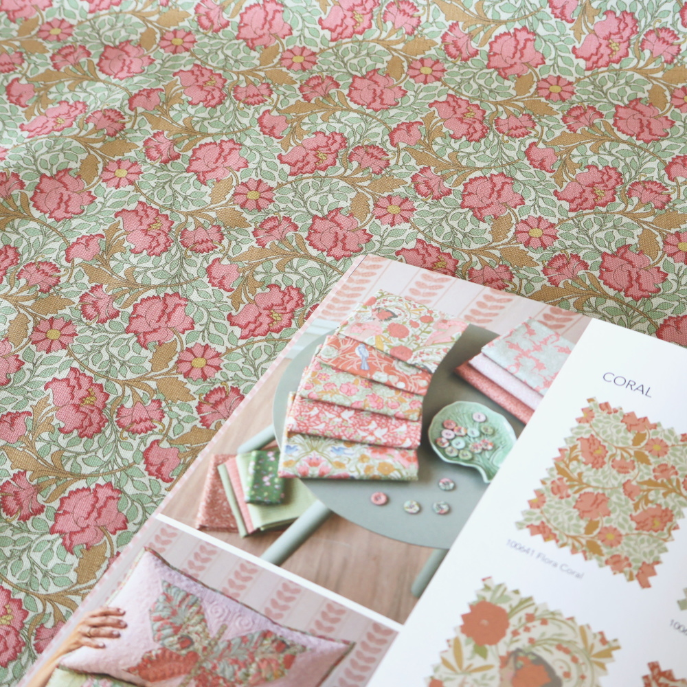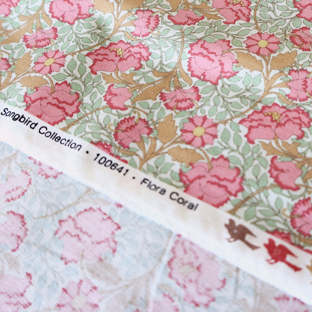 「Songbird」コレクションから、やわらかなミントグリーンの地に、コーラルピンクの花とあたたかみのあるベージュのつる葉が広がるクラシカルなフローラルプリントです。アールヌーヴォーを思わせる流れるラインが美しく、やさしい華やかさと落ち着きをあわせ持つデザイン。細かな総柄で、小物づくりからクッション、パッチワークまで幅広く使いやすい一枚です。