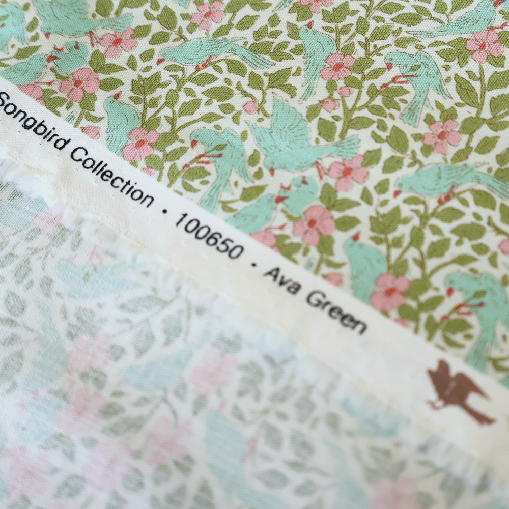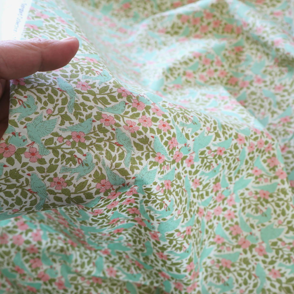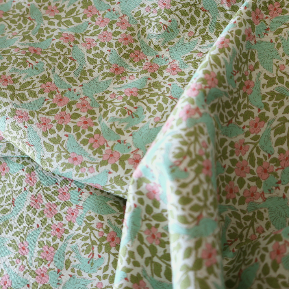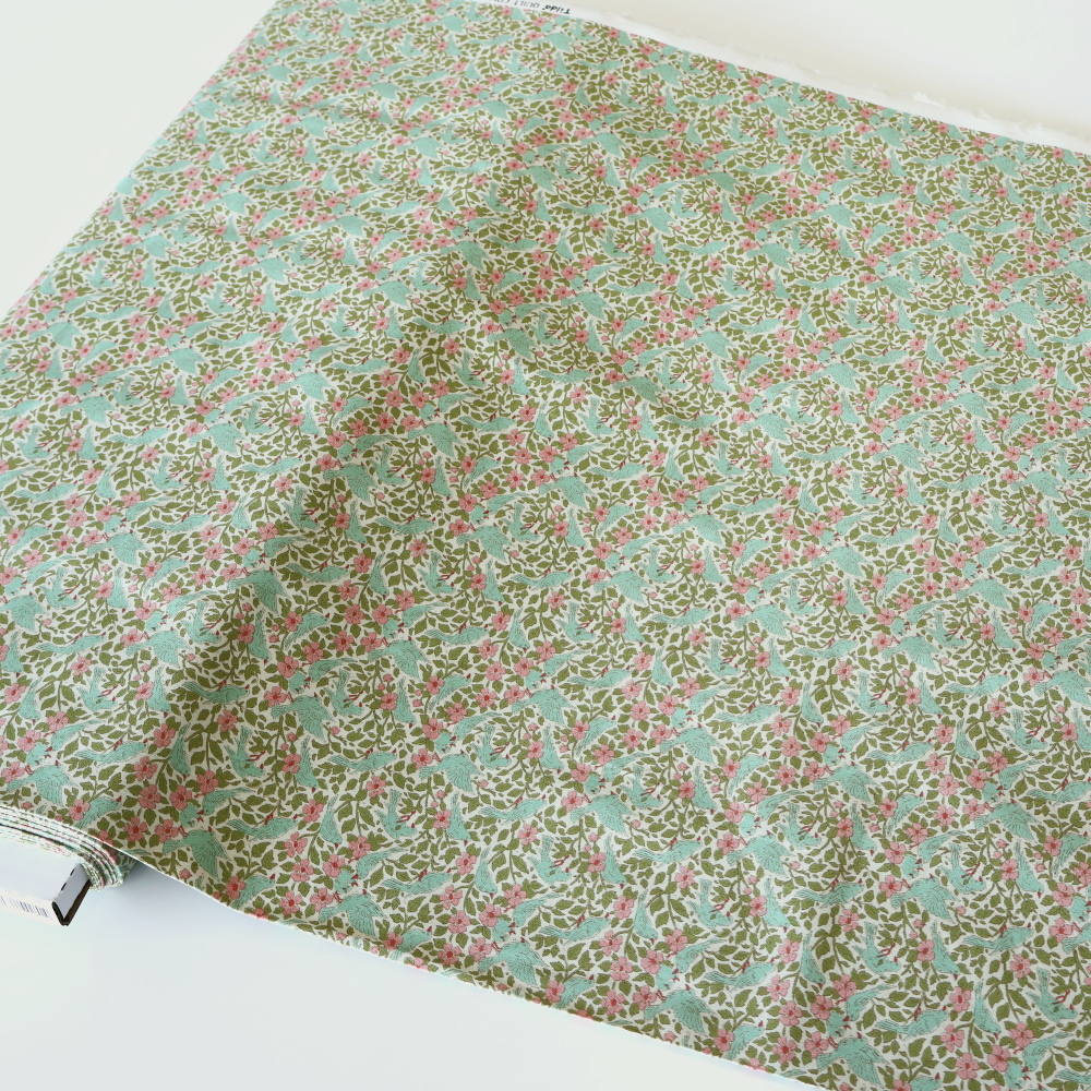 「Songbird」コレクションから、やわらかなグリーンの葉にミントブルーの小鳥とピンクの花々が広がる、可憐でやさしい雰囲気のフローラルプリントです。流れるような植物のラインが美しく、アールヌーヴォーを思わせる上品なリズムが感じられます。よく見ると、巣の中の小鳥とエサを運ぶ親鳥の姿が描かれており、さりげない物語も楽しめるデザインです。小物づくりからクッション、パッチワークまで幅広く使いやすい一枚です。