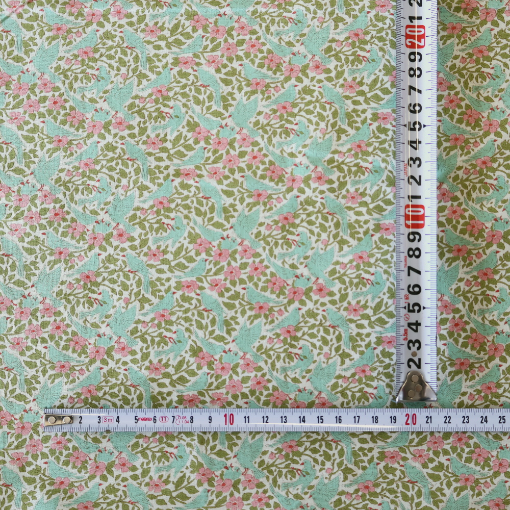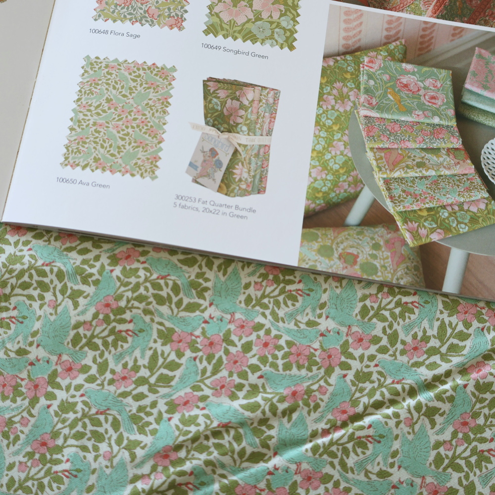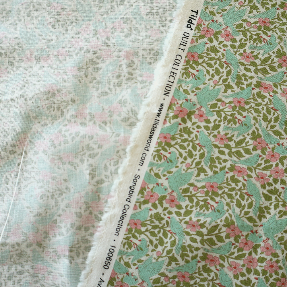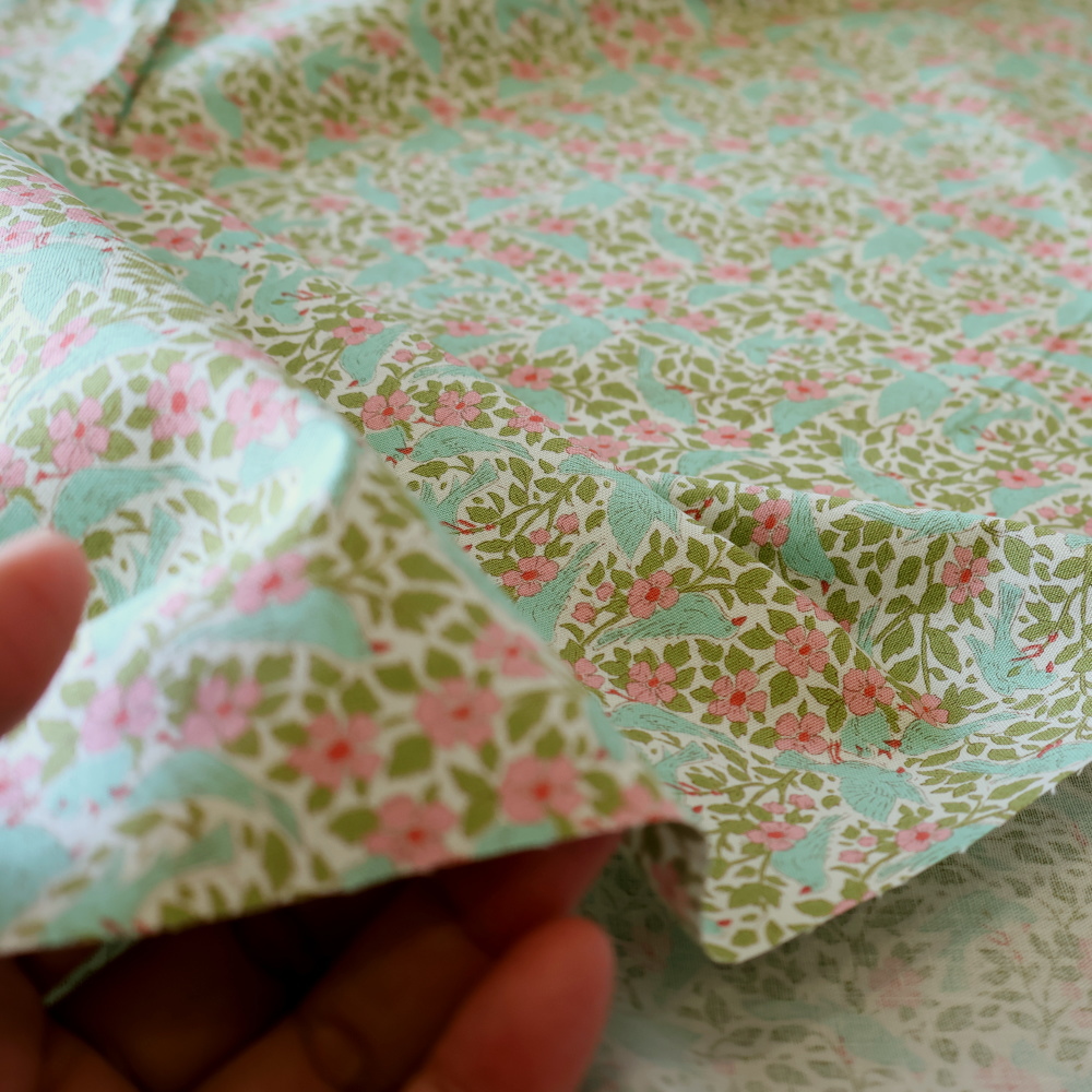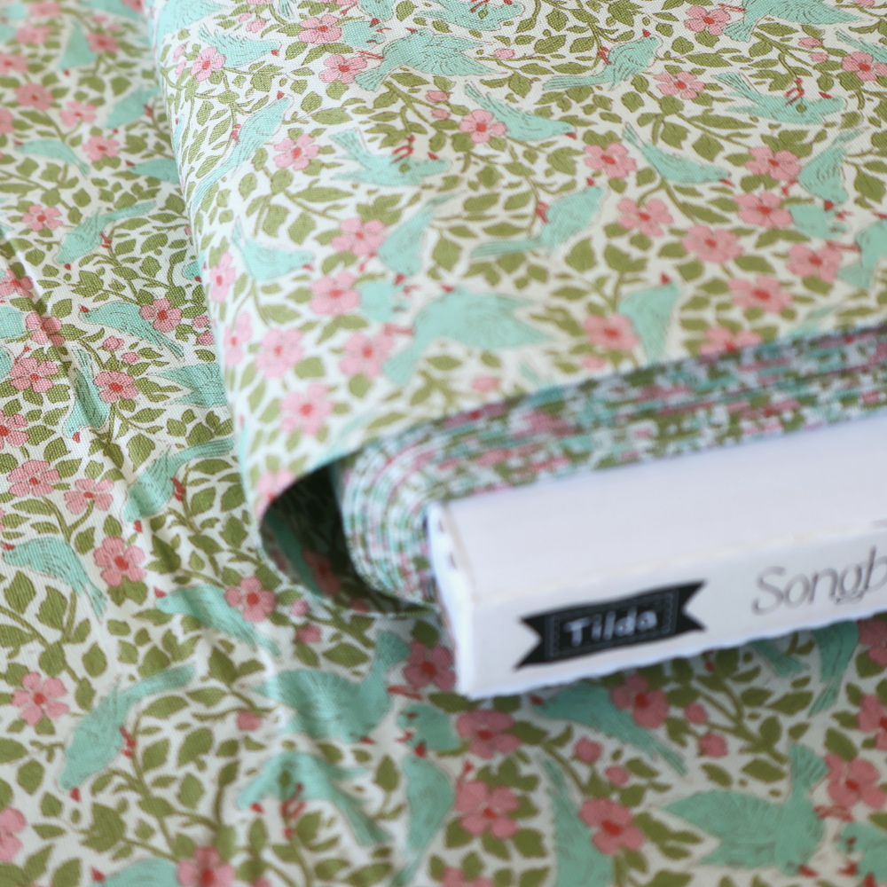 「Songbird」コレクションから、やわらかなグリーンの葉にミントブルーの小鳥とピンクの花々が広がる、可憐でやさしい雰囲気のフローラルプリントです。流れるような植物のラインが美しく、アールヌーヴォーを思わせる上品なリズムが感じられます。よく見ると、巣の中の小鳥とエサを運ぶ親鳥の姿が描かれており、さりげない物語も楽しめるデザインです。小物づくりからクッション、パッチワークまで幅広く使いやすい一枚です。