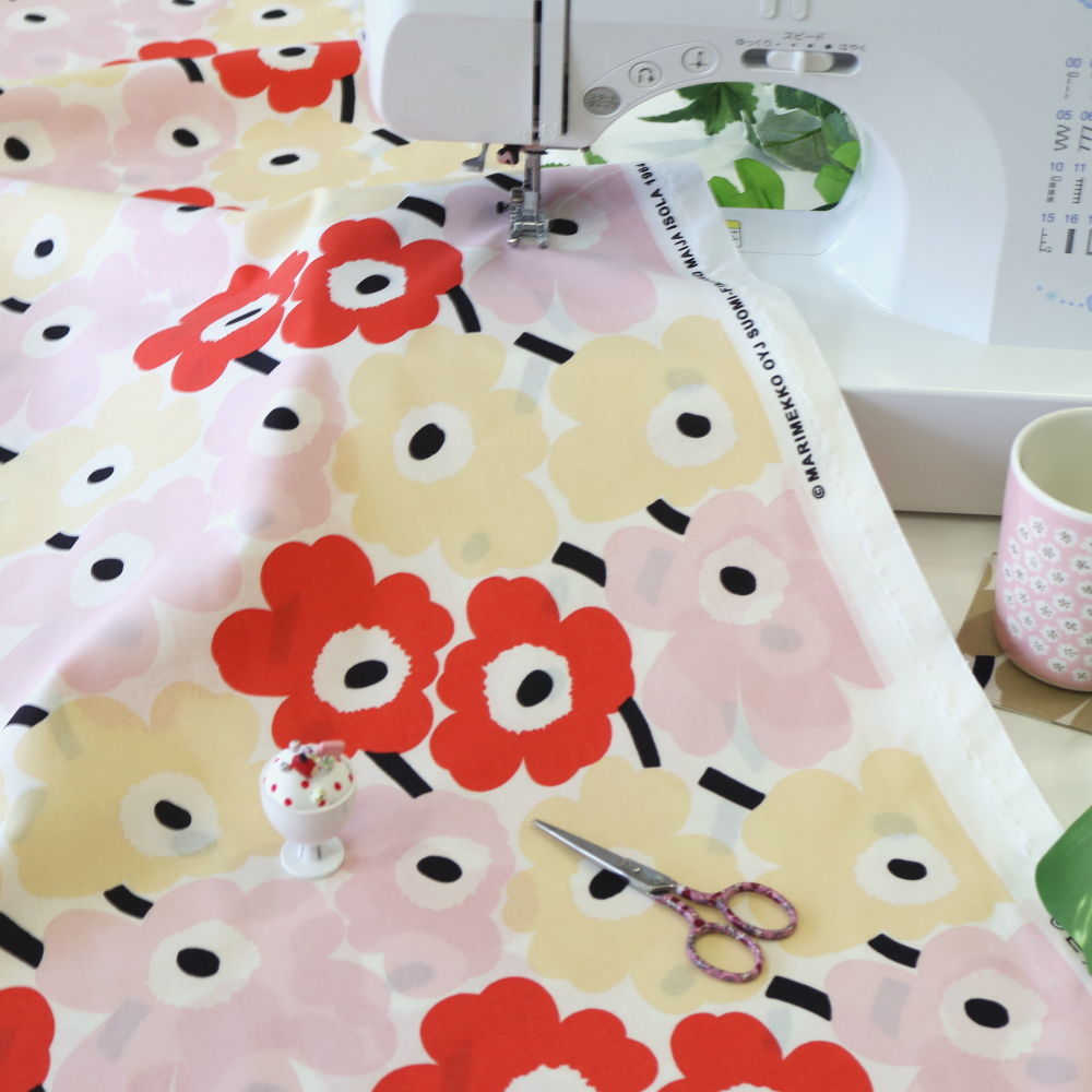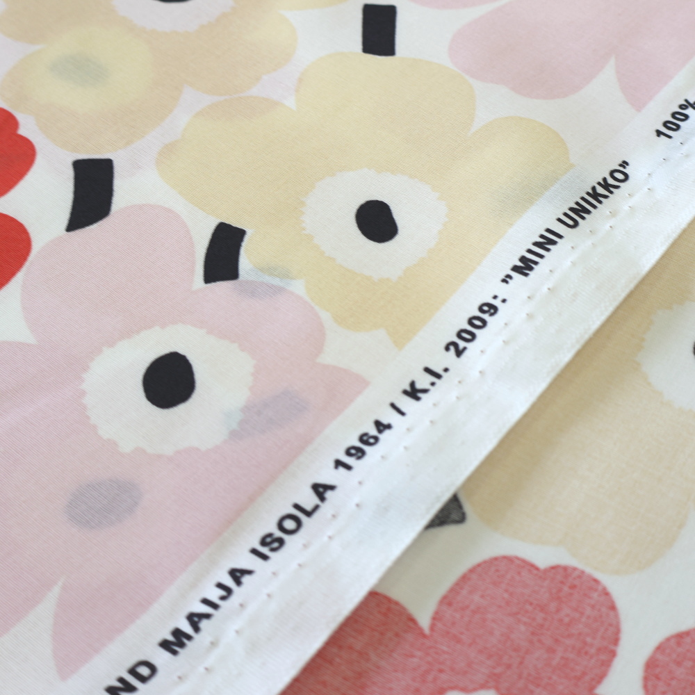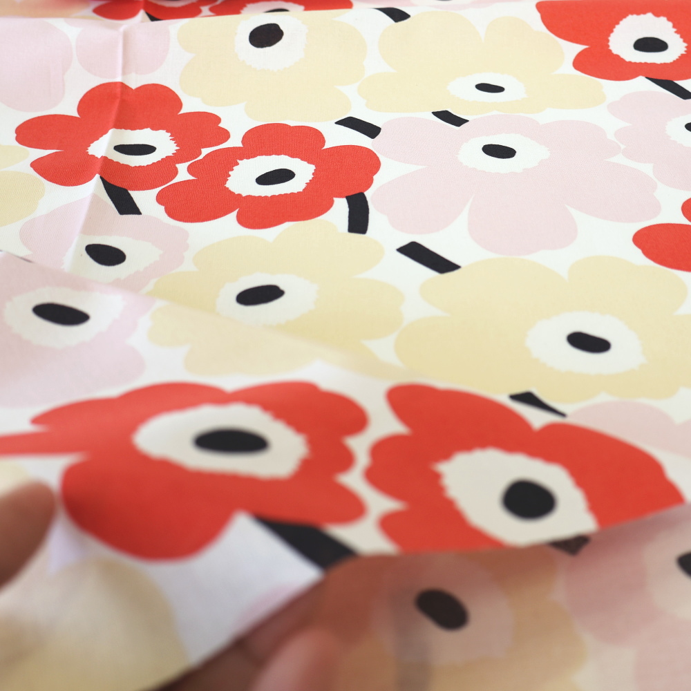 マリメッコのフラワーパターンMini Unikkoの、日本限定カラーのファブリックです。ライトピンクをベースに、ライトイエローと鮮やかな赤がやさしく映える明るい配色で、クッションカバーや小窓のカーテン、テーブルまわりのクロスなど、日常の布ものに取り入れやすい柄です。