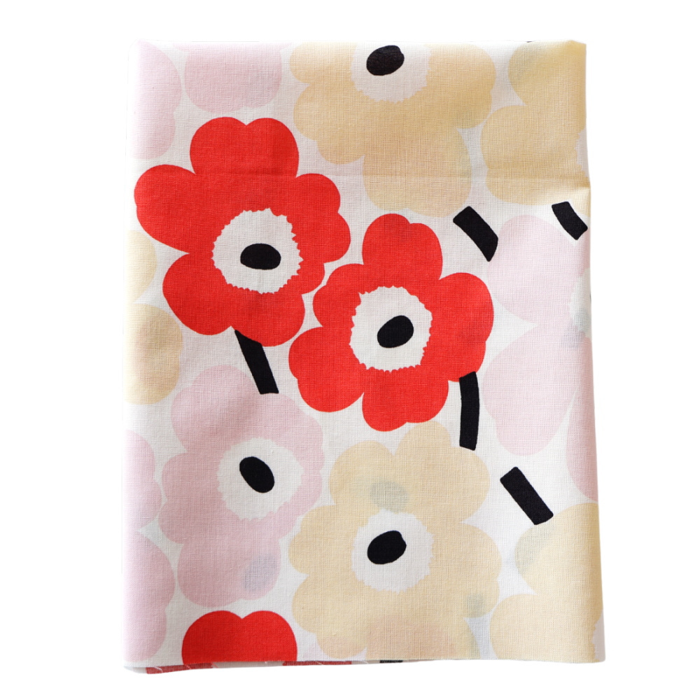 マリメッコの定番柄Mini Unikkoから、日本限定カラーが登場しました。ライトピンクとライトイエローを重ねた、やさしく落ち着いた配色です。色のトーンがやさしく、インテリアや小物づくりに自然となじむ一枚です。