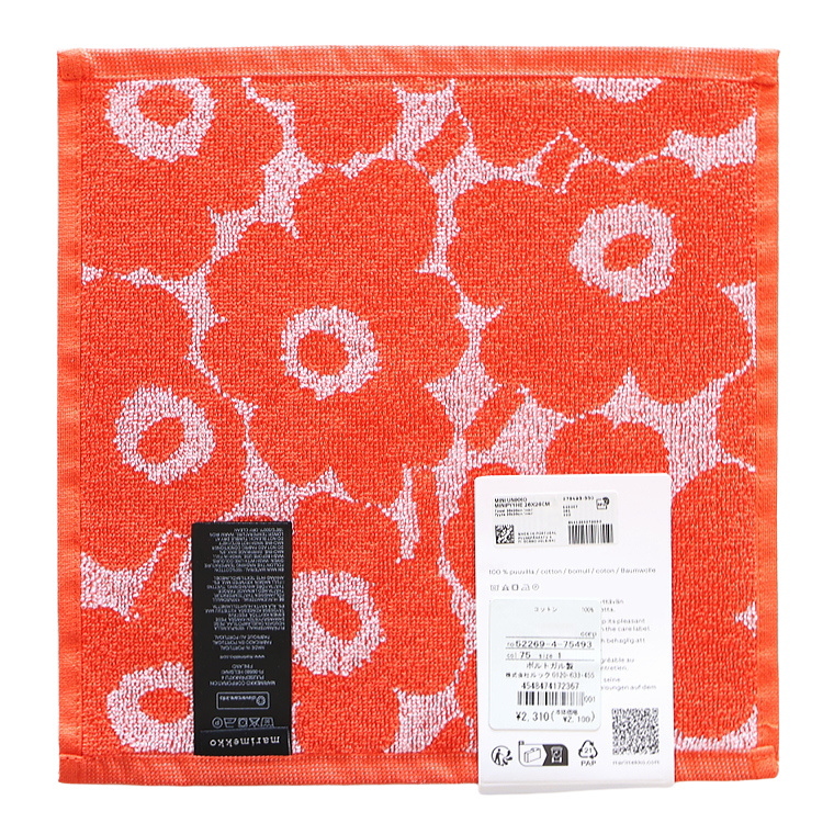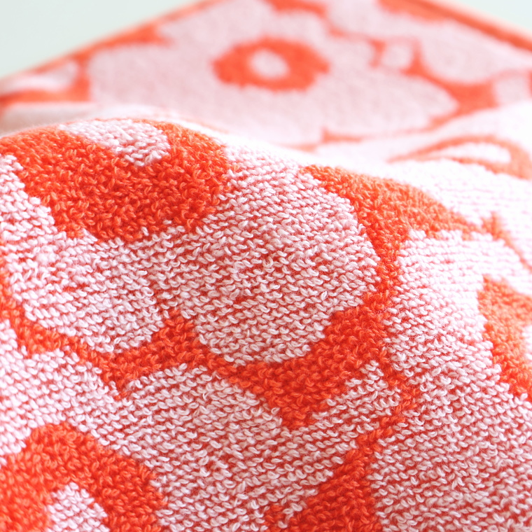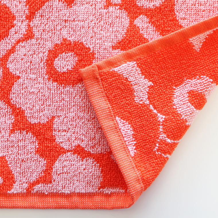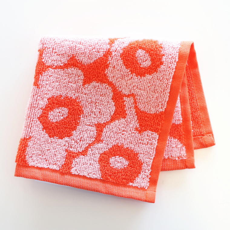 ぱっと目を引くオレンジカラーに、やさしく浮かぶMINI UNIKKO柄のミニタオルです。日本限定で展開されているモデルで、明るく華やかな印象。しっかりとした厚みのあるパイルで、見た目以上に実用的に使えます。日常使いはもちろん、ちょっとした贈りものにも取り入れやすい一枚です。