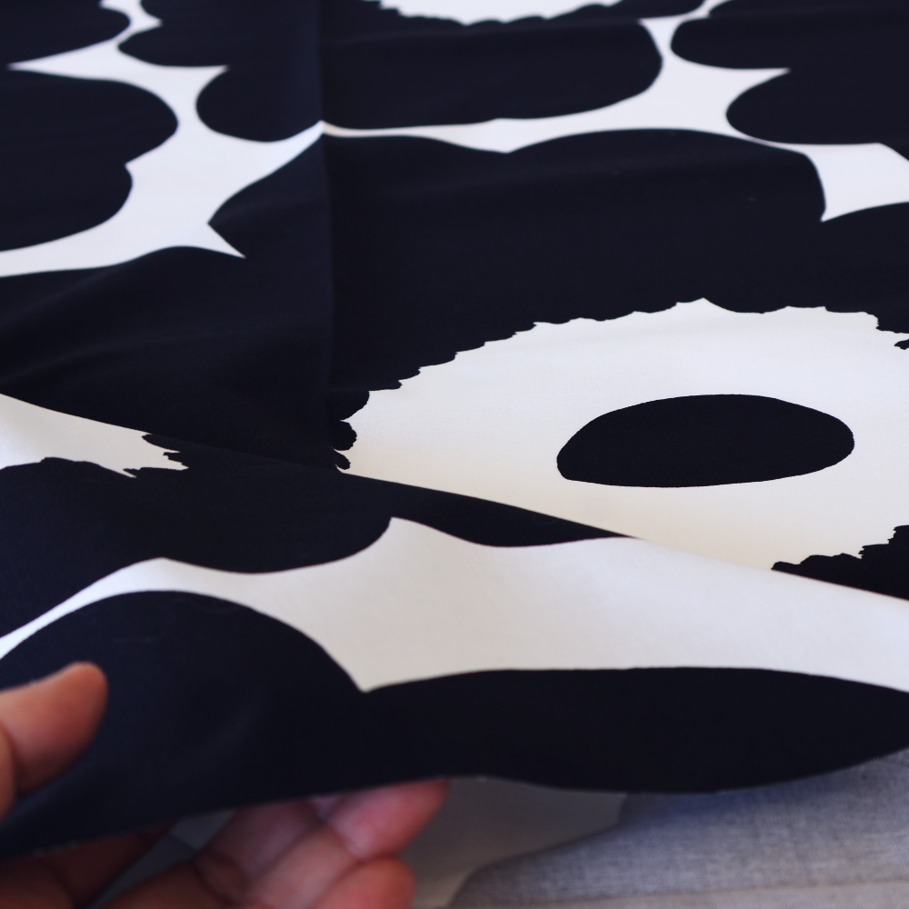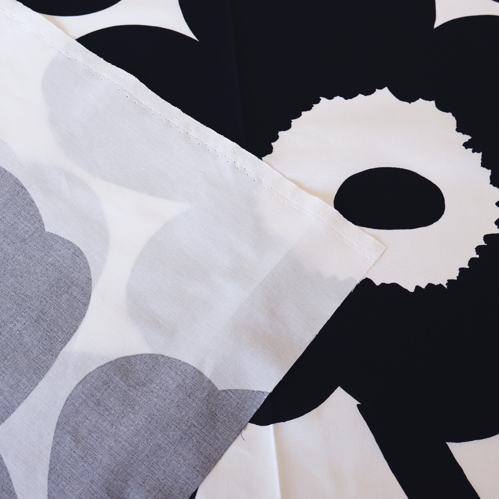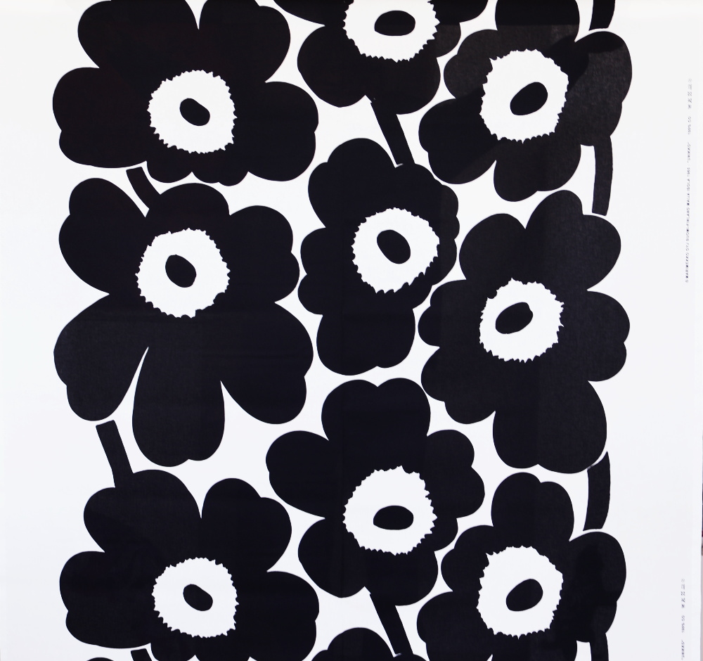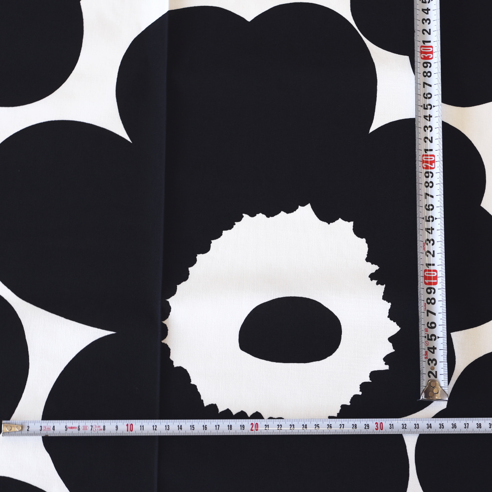 マリメッコを代表するテキスタイル「Unikko(ウニッコ)」のコットンファブリックです。 3サイズ展開の中で最も大きい柄で、ダイナミックな花モチーフが印象的に広がります。 ブラック×ホワイトのモノトーン配色は、ウニッコの大胆な輪郭をより引き立てるカラー。 テキスタイルデザインはMaija Isola(マイヤ・イソラ)。はっきりとしたコントラストで、空間に洗練されたリズムを生み出します。