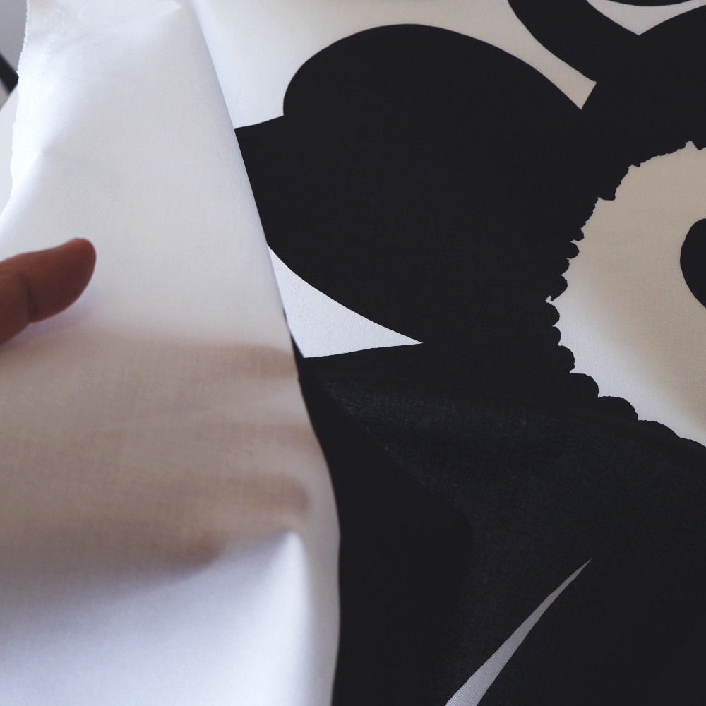 3サイズ展開の中で最も大きい柄で、ブラック×ホワイトのコントラストが印象的なデザイン。大柄ならではの存在感があり、カーテンやタペストリーなど空間のアクセントとして取り入れやすい一枚です。