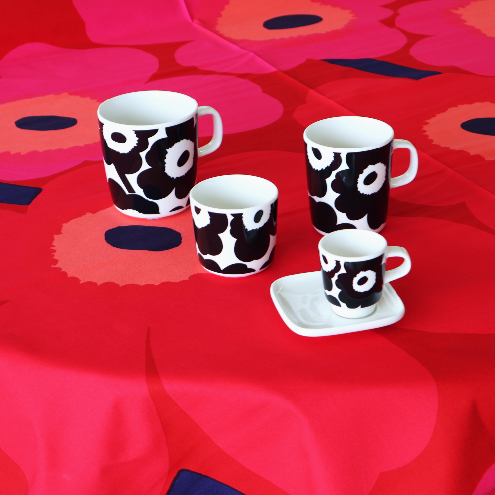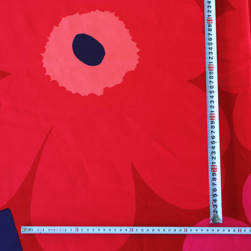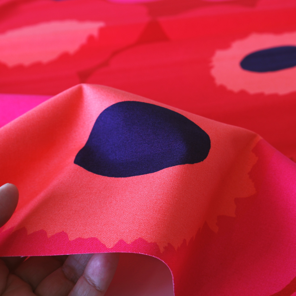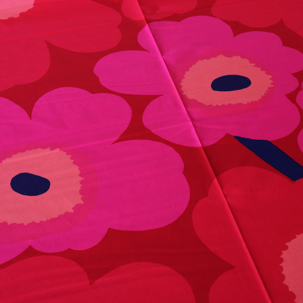 「Unikko(ウニッコ)」のコットンファブリック、廃番カラーのNo.301です。 赤をベースに、ピンクの花が重なる華やかな配色が特徴で、ウニッコらしい存在感をより強く感じられるデザイン。 現在は生産されていないカラーのため、限られた在庫のみのご案内となります。 テキスタイルデザインはMaija Isola(マイヤ・イソラ)。大胆でリズミカルなパターンが空間を印象的に彩ります。