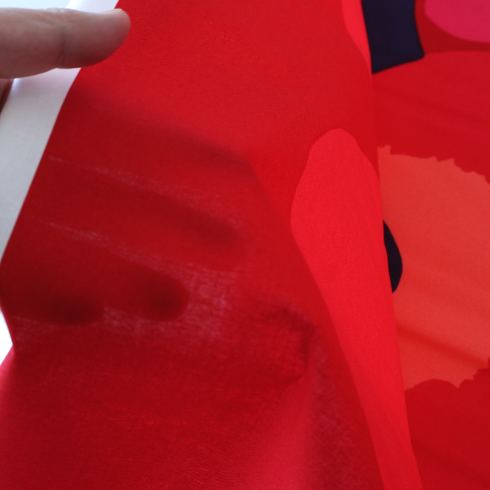 3サイズ展開の中で最も大きい柄で、赤地にピンクの花が重なる華やかなデザイン。大柄ならではの存在感があり、カーテンやタペストリーなど空間を明るく彩る一枚です。現在は生産されていないカラーのため、在庫限りのご案内となります。